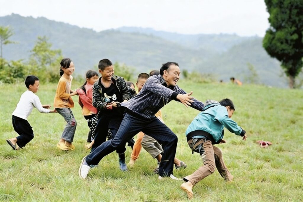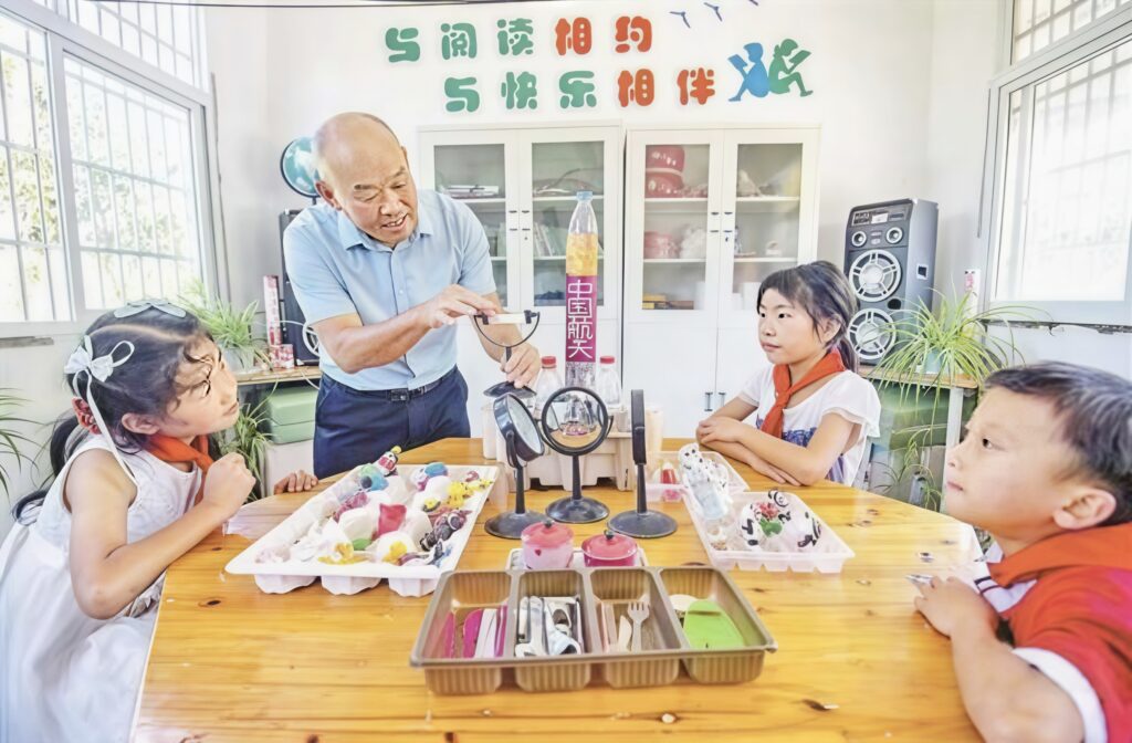 学前班的孩子坐不住,他就领到屋后的毛草坪上,教他们认草、识虫,跟着风念短句,山野就是课堂。
